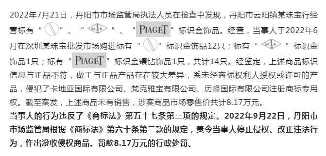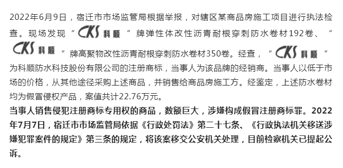 当事人将上述侵权产品销售给该工程承包方,违法经营额超5万元,涉嫌犯罪。2022年8月22日,如皋市市场监管局依据《行政处罚法》第二十七条、《行政执法机关移送涉嫌犯罪案件的规定》第三条的规定,将该案移送公安机关。