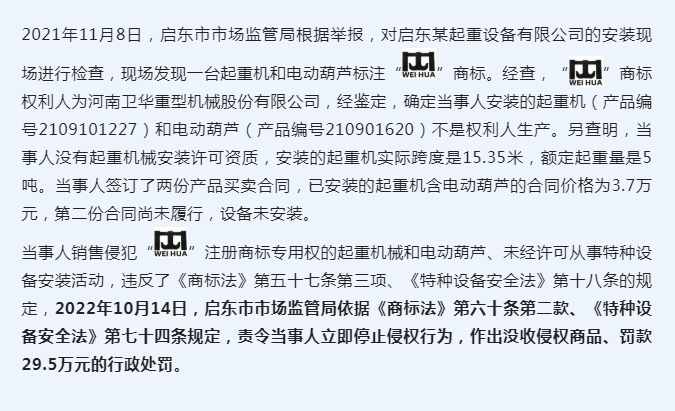 南通启东市市场监管局查处启东某起重设备有限公司销售侵犯注册商标专用权起重机和、未经许可从事特种设备起重机安装案