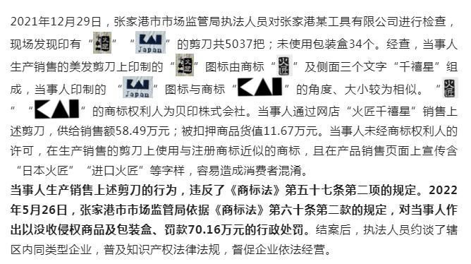 苏州张家港市市场监管局查处张家港某工具有限公司生产销售侵犯注册商标专用权剪刀案