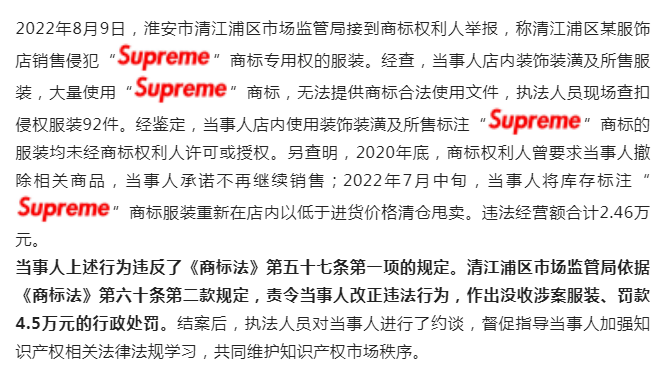 当事人的上述行为违反了《商标法》第五十七条第三项的规定,构成侵犯注册商标专用权的行为。2022年1月24日, 宿豫区市场监管局依据《商标法》第六十条第二款的规定,对当事人作出没收侵权商品、罚款3万元的行政处罚。